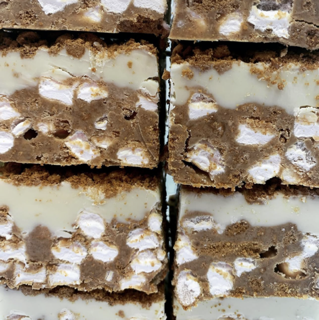 A chunky slab of rocky road made with white chocolate biscoff crumb and marshmallows.