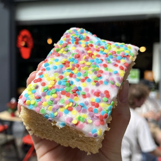 VANILLA SPONGE CAKE TOPPED WITH ICING AND SPRINKLES